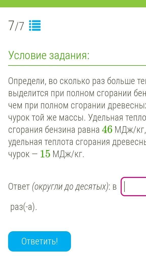 Определи, во сколько раз больше теплоты выделится при полном сгорании бензина, чем при полном сгорании древесных чурок той же массы. Удельная теплота сгорания бензина равна 46 МДж/кг, удельная теплота сгорания древесных чурок — 15 МДж/кг.