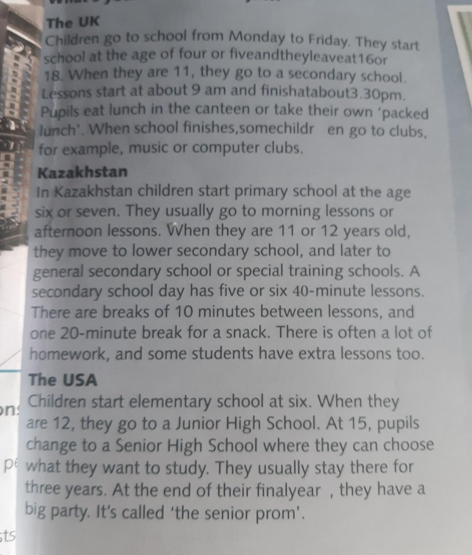 Children go to school from Monday to Friday. They start school at the age of four or fiveandtheyleaveat 16or 18. When they are 11, they go to a secondary school. Lessons start at about 9 am and finishatabout3.30pm. Pupils eat lunch in the canteen or take their own 'packed lunch. When school finishes,somechildren go to clubs, for example, music or computer clubs. Kazakhstan In Kazakhstan children start primary school at the age six or seven. They usually go to morning lessons or afternoon lessons. When they are 11 or 12 years old, they move to lower secondary school, and later to general secondary school or special training schools. A secondary school day has five or six 40-minute lessons. There are breaks of 10 minutes between lessons, and one 20-minute break for a snack. There is often a lot of homework, and some students have extra lessons too. The USA n Children start elementary school at six. When they are 12, they go to a Junior High School. At 15. pupils change to a Senior High School where they can choose what they want to study. They usually stay there for three years. At the end of their finalyear, they have a big party. It's called 'the senior ВЫПИСАТЬ ИЗ ТЕКСТА ВСЕ ГЛАГОЛЫ