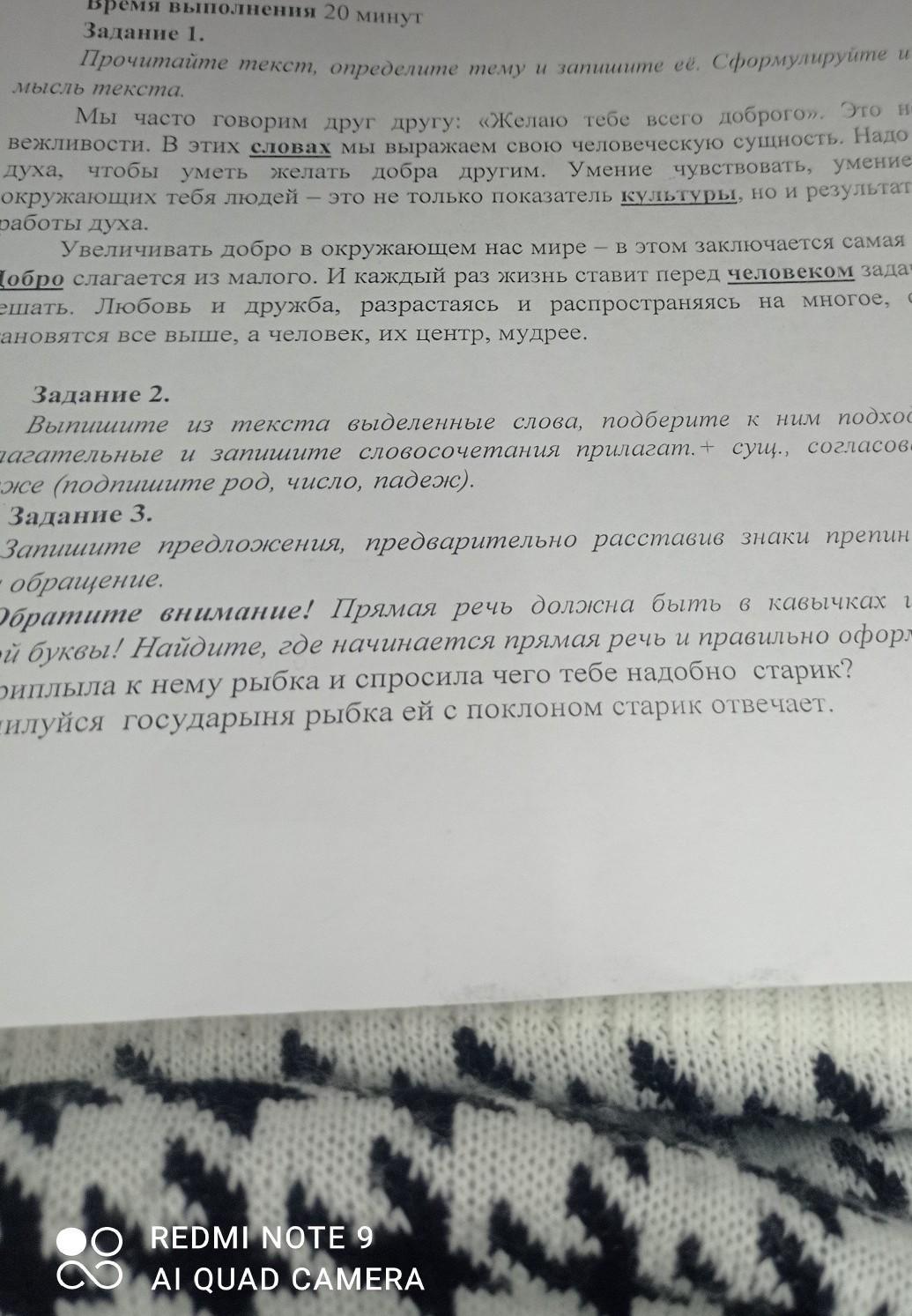 Задание 2. Выпишите из текста выделенные слова, под прилагательные и запишите словосочетания прилаа падеже (подпишите род, число, падеж). Задание 3. Запишите предложения, предварительно расс речь и обращение. Обратите внимание! Прямая речь должна большой буквы! Найдите, где начинается прямая ре Приплыла к нему рыбка и спросила чего тебе Смилуйся государыня рыбка ей с поклоном с