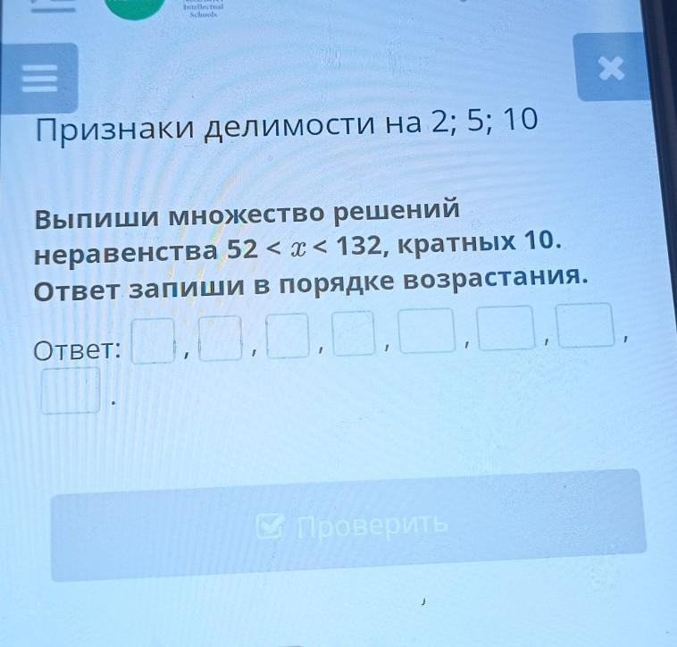 ИНТЕРАКТИВНЫЙ УРОК Открыть с х Признаки делимости на 2; 5; 10 Выпиши множество решений неравенства 52 < x < 132, кратных 10. Ответ запиши в порядке возрастания. Ответ: ,