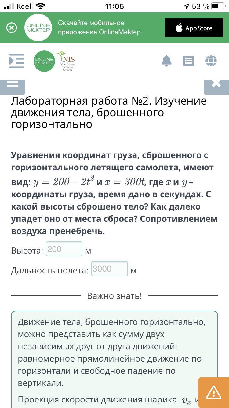 Уравнения координат груза, сброшенного с горизонтального летящего самолета, имеют вид: y = 200 – 2t2 и x = 300t, где x и y – координаты груза, время дано в секундах. С какой высоты сброшено тело? Как далеко упадет оно от места сброса? Сопротивлением воздуха пренебречь. Высота: ?м