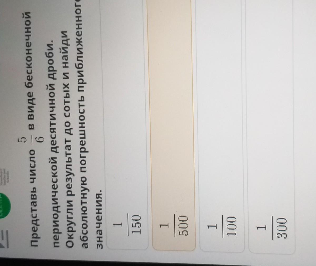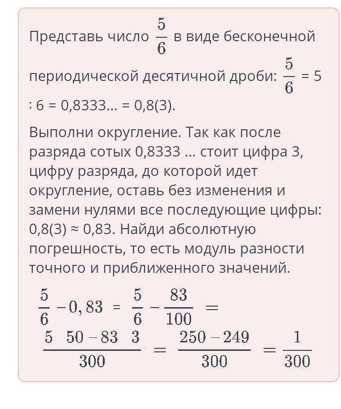 5/6 Представь число в виде бесконечной периодической десятичной дроби. Округли результат до сотых и найди абсолютную погрешность приближенного значения.