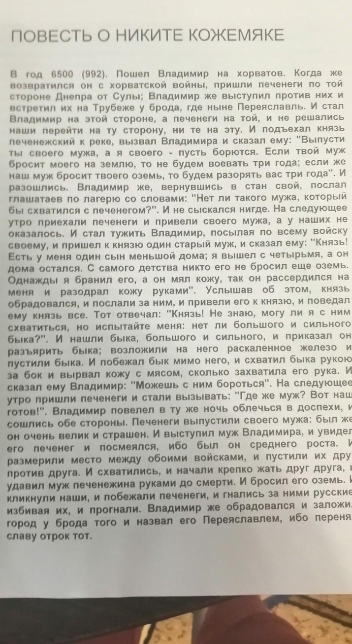 Когда-то, очень давно, возле Киева появился страшный Змей. Он наносил окрестностям большие беды – разорял, грабил ближайшие города и села, и забирал на съедение самую красивую из девушек. Через некоторое время очередь дошла до дочери царя. Но Змей, потрясенный ее красотой, не съел царевну, а взял себе в жены и запер в пещере. Когда он уходил на свой ужасный промысел, то запирал ее огромным валуном. У царевны была собачонка, она проследила куда Змей уволок красавицу и, когда того не было, то носила от царевны весточки к родным. Однажды царь попросил узнать у Змея, кто его сильней и сможет победить. Царевна так и сделала и написала, чтоб родители нашли в Киеве Никиту Кожемяку – только он может ее освободить.