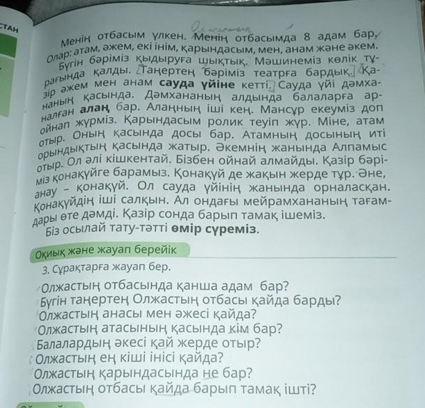 Оқиық және жауап берейік 3. Сұрақтарға жауап бер. Олжастың отбасында қанша адам бар? Бүгін таңертең олжастың отбасы қайда барды? Олжастың анасы мен әжесі қайда? Олжастың атасының қасында кім бар? Балалардың әкесі қай жерде отыр? Олжастың ең кіші інісі қайда? Олжастың қарындасында не бар? Олжастың отбасы қайда барып тамақ ішті?.