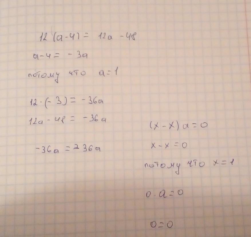 Какие свойства действий позволяют утверждать, что данное ра- венство является тождеством: а) 12(a - 4) = 12а – 48; б) (х – х) а = 0?