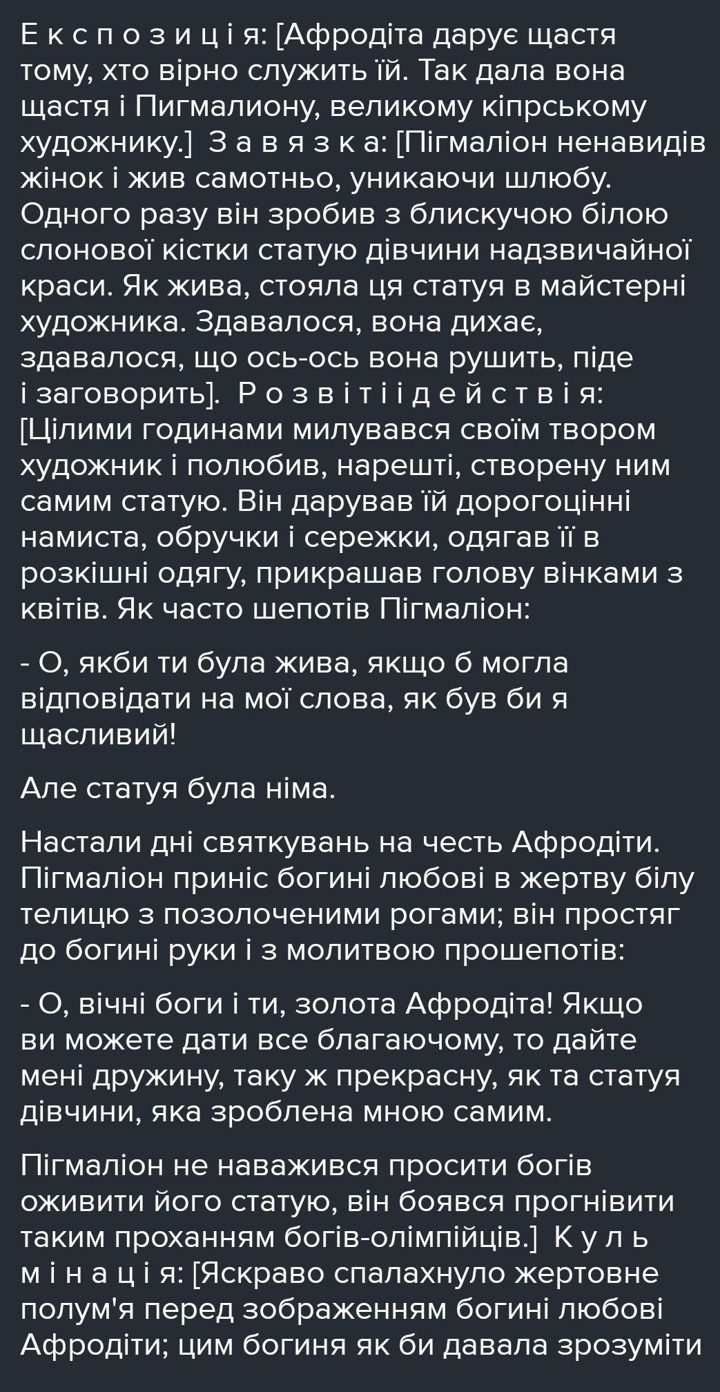 Визначте складники сюжету міфу Пігмаліон і Галатея :експозиція, зав'язка,розвиток дії, кульмінація, розв'язка?