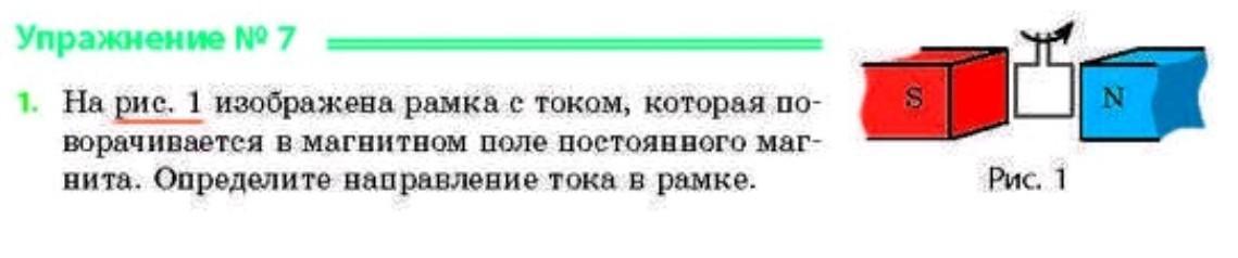 На рис. 1 изображена рамка с током, которая по ворачивается в магнитном поле постоянного маг нита. Определите направление тока в рамке.