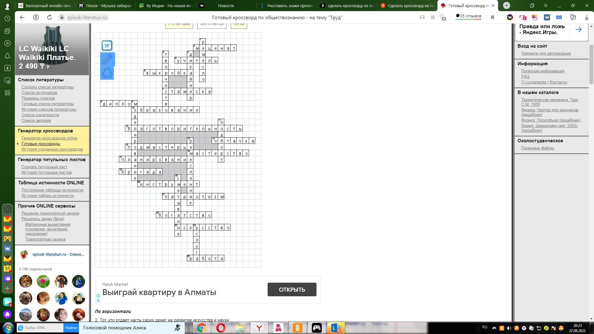 Кроссворд по предмету обществознанию - на тему 'Труд'