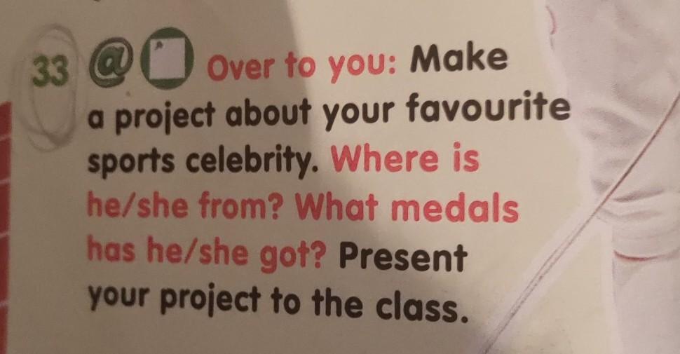 33 @ over to you: Make a project about your favourite sports celebrity. Where is he/she from? What medals has he/she got? Present your project to the class. ПОМОГИ ПОЖАЛУЙСТА