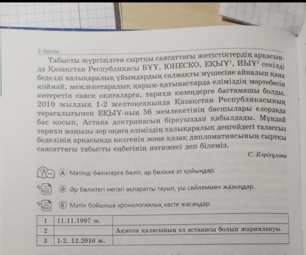 ( А Мәтінді бөліктерге бөліп , әр бөлікке ат қойыңдар . Ә Әр бөліктегі негізгі ақпаратты тауып , үш сөйлеммен жазыңдар . Б Мәтін бойынша хронологиялық кесте жасаңдар . 1 11.11.1997 ж . Ақмола қаласының ел астанасы болып жариялануы . 2 3 1-2 . 12.2010 ж . инактап тар матін