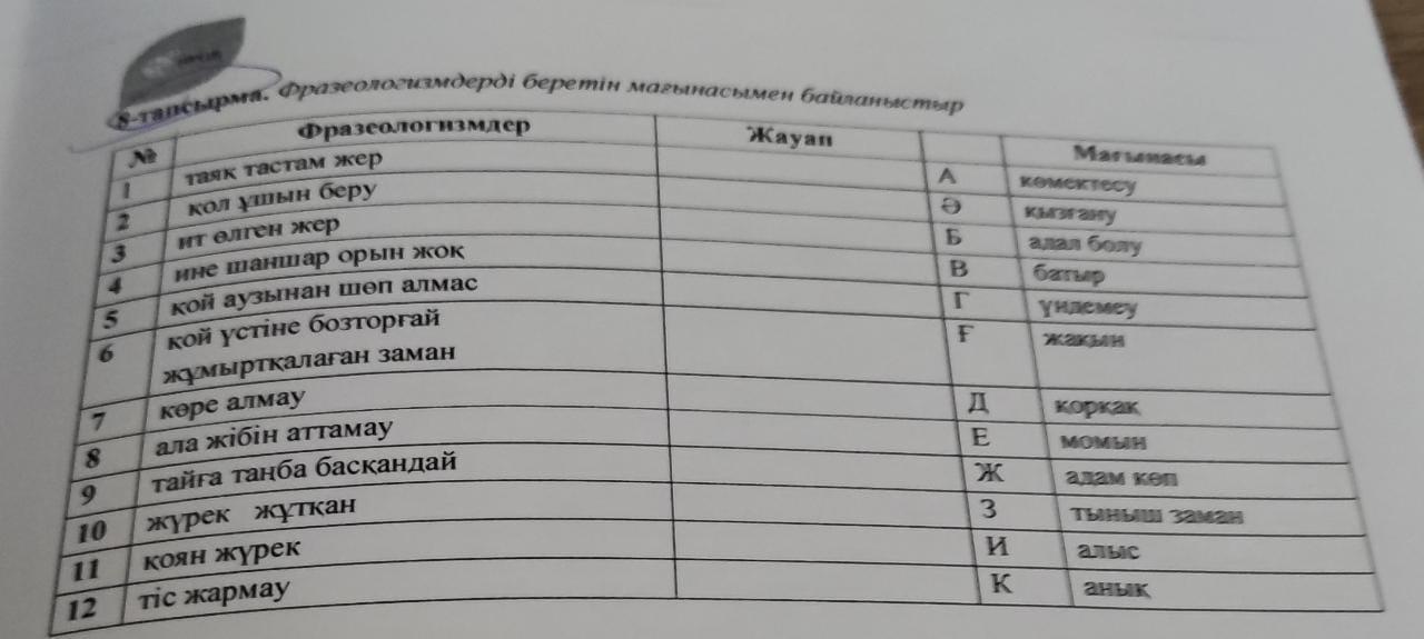 1)Ғ, 2)А, 3)И, 4)Ж, 5)Е, 6)З, 7)Ә, 8)Б, 9)К, 10)В, 11)Д, 12)Г