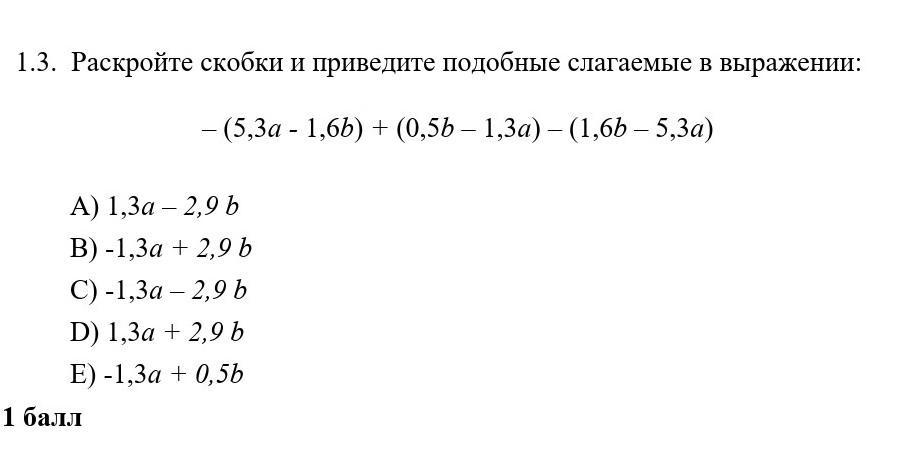 -(5,3а-1,6b) + (0,5b-1,3a) - (1,6b-5,3a)= -5,3a+1,6b+0,5b-1,3a-1,6b+5,3a= -1,3a+0,5b