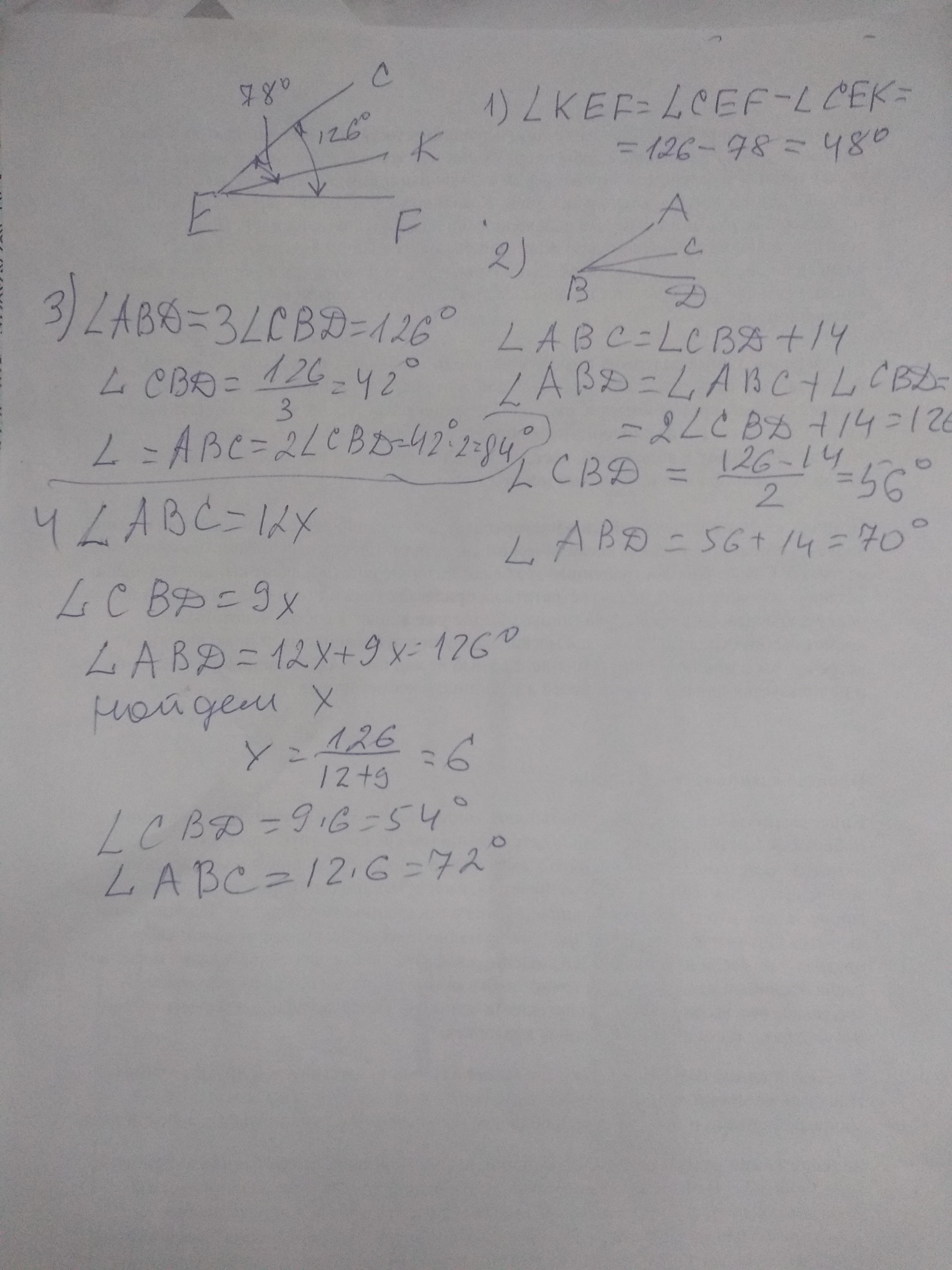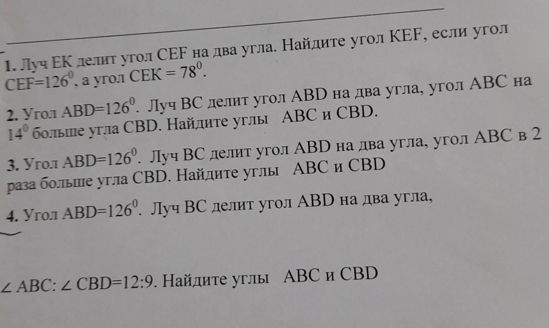 1. Луч ЕК делит угол CEF на два угла. Найдите угол KEF, если угол CEF=126°, а угол CEK = 78°. 2. Угол ABD=126°. Луч ВС делит угол ABD на два угла, угол АВС на 14 больше угла CBD. Найдите углы ABC и CBD. 3. Угол ABD=126°. Луч ВС делит угол ABD на два угла, угол АВС в 2 раза больше угла CBD. Найдите углы ABC и CBD 4. Угол ABD=126". Луч ВС делит угол ABD на два угла,