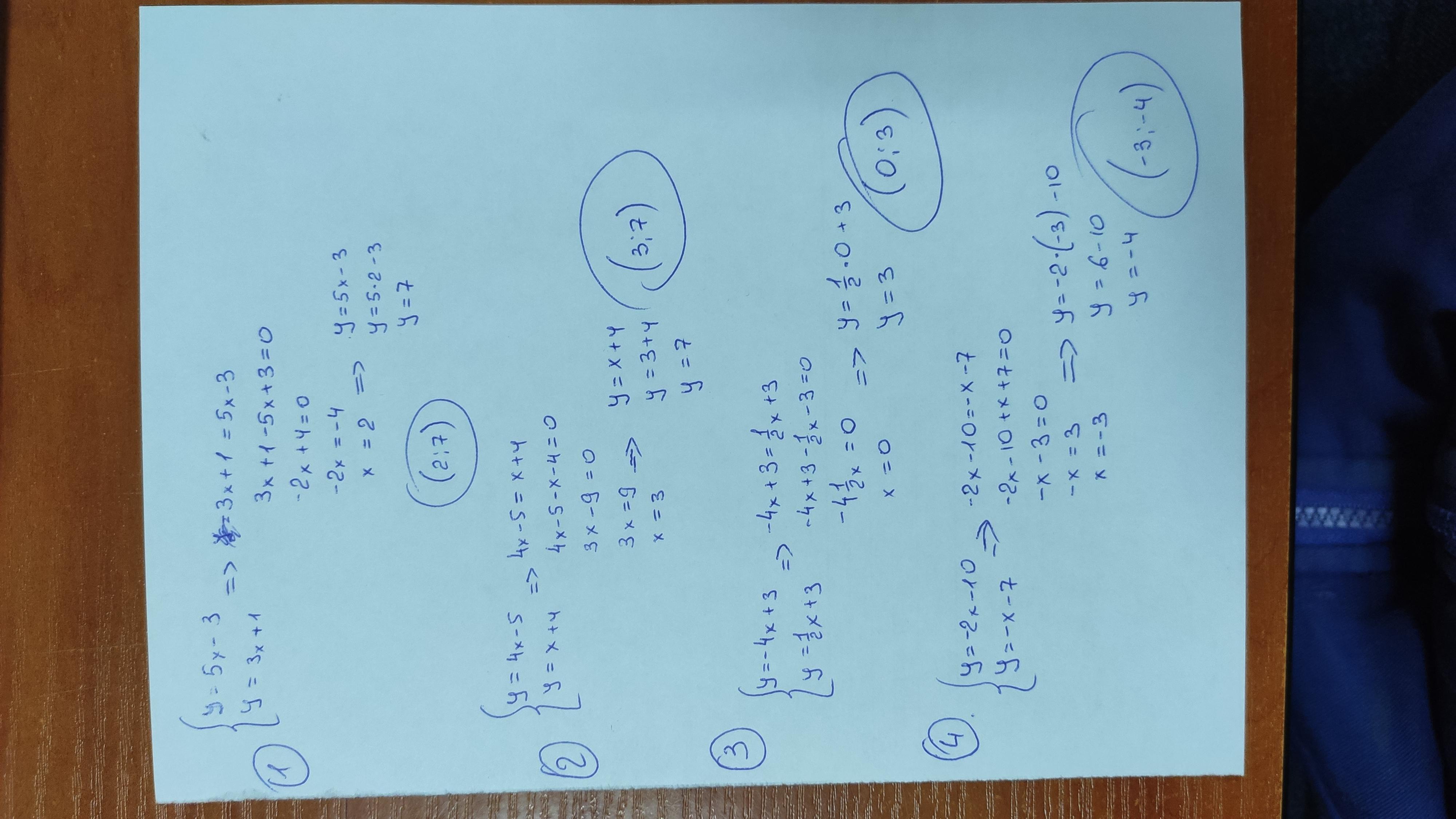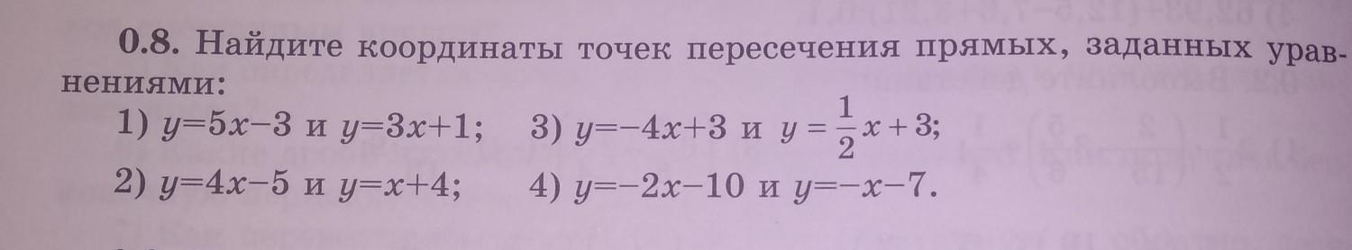найдите координаты точек пересечения прямых заданных уравнениями 1)у=5х-4 и у=3х+1; 2)у=4х-5 и у=х+4; 3)у= -4х+3 и у= 1/2х +3 4)у= -2х-10 и у= - х-7