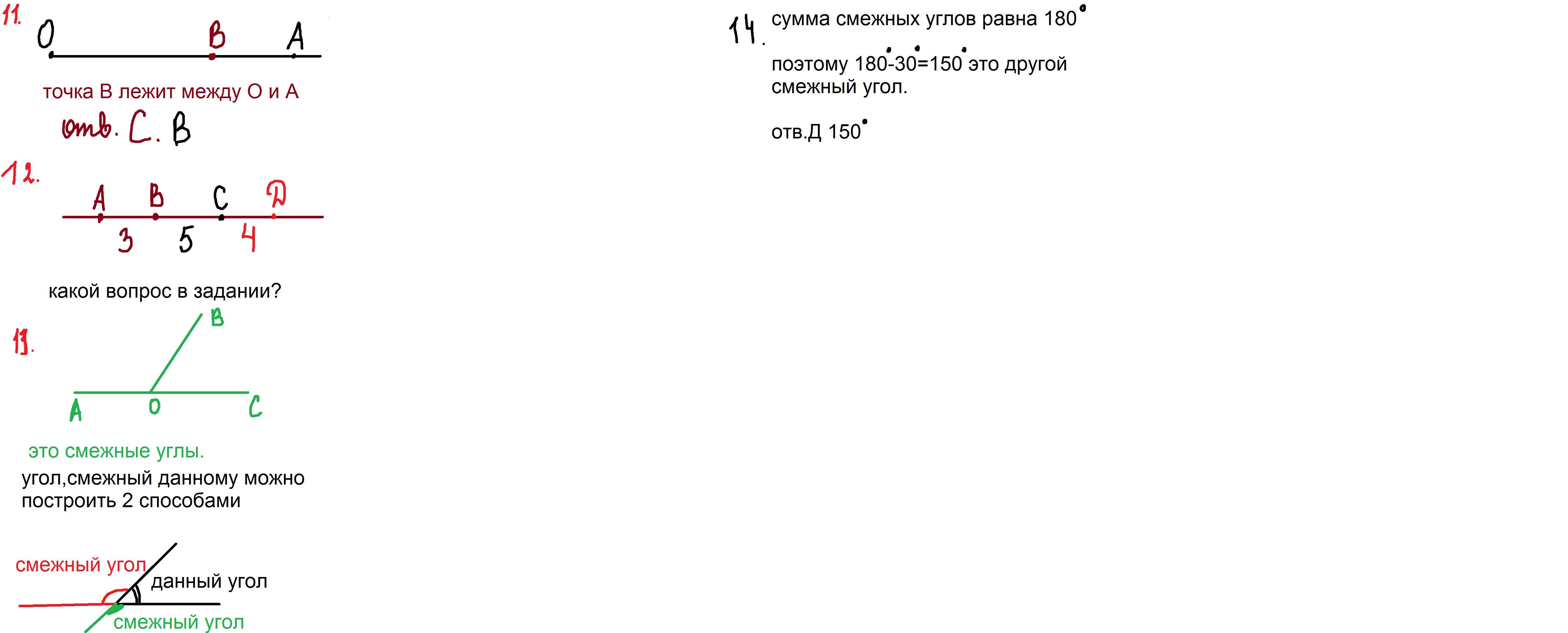 13. Сколько имеется углов, смежных данному: A. 1. B.2. C.3. D.4?