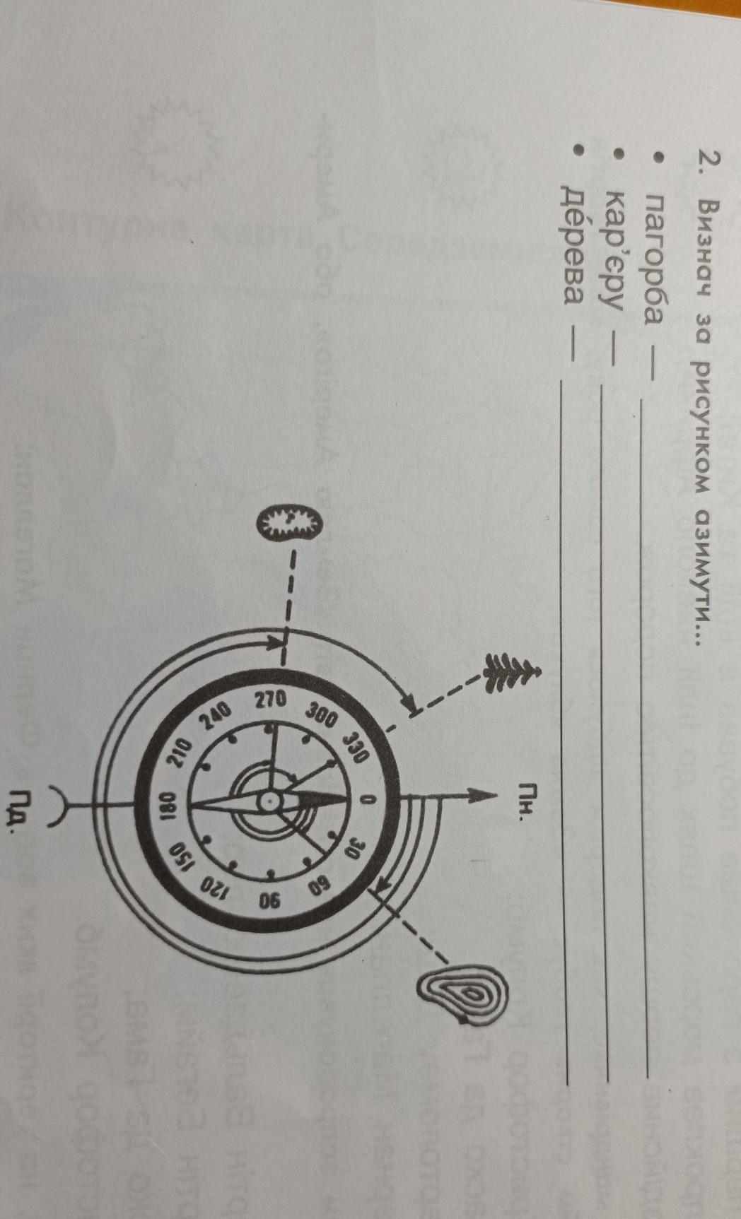 Ответ:пагорба-пн.сх 30°, кар’єру-зх,270°, дерева-пн.зх 330°
