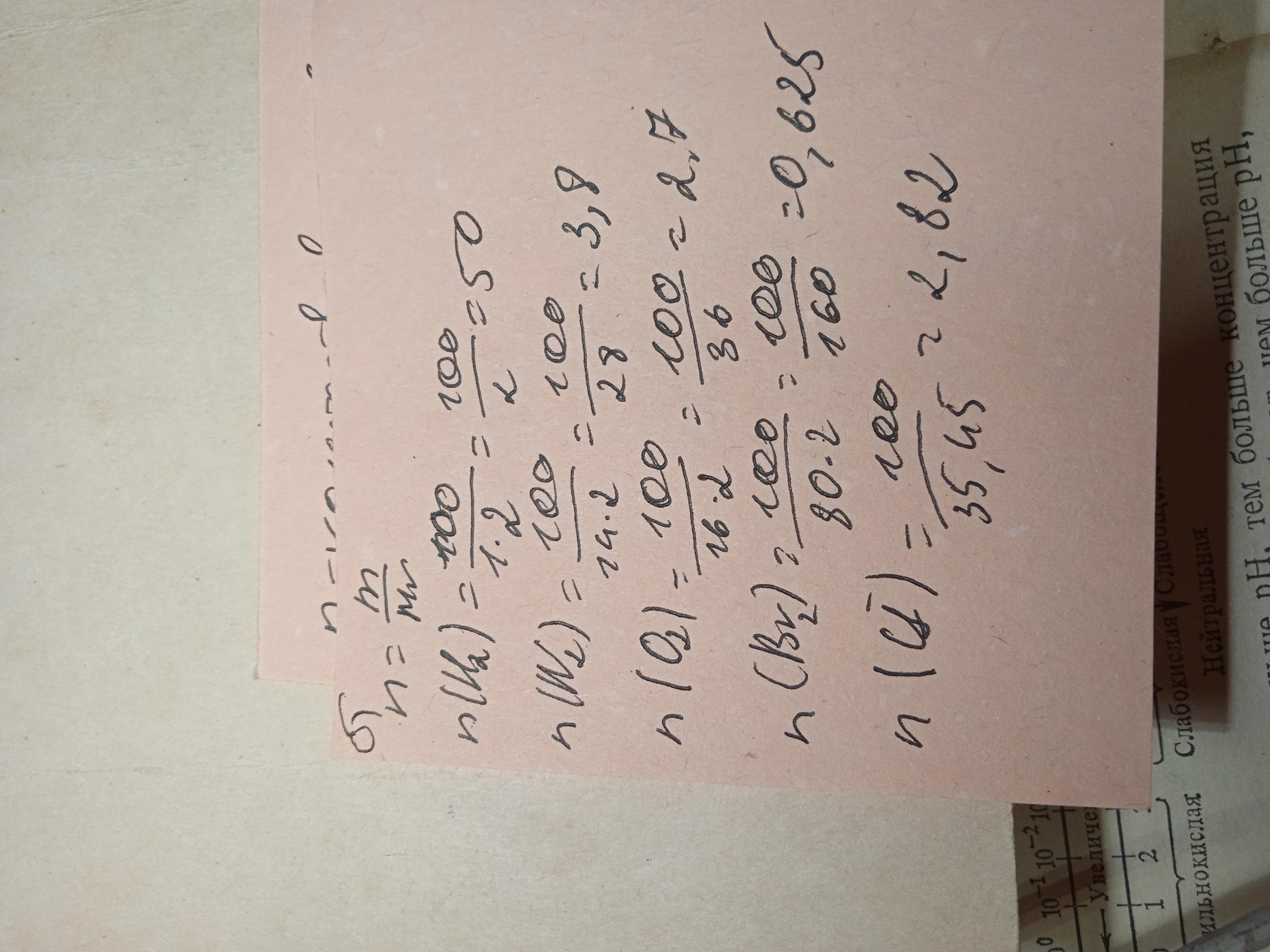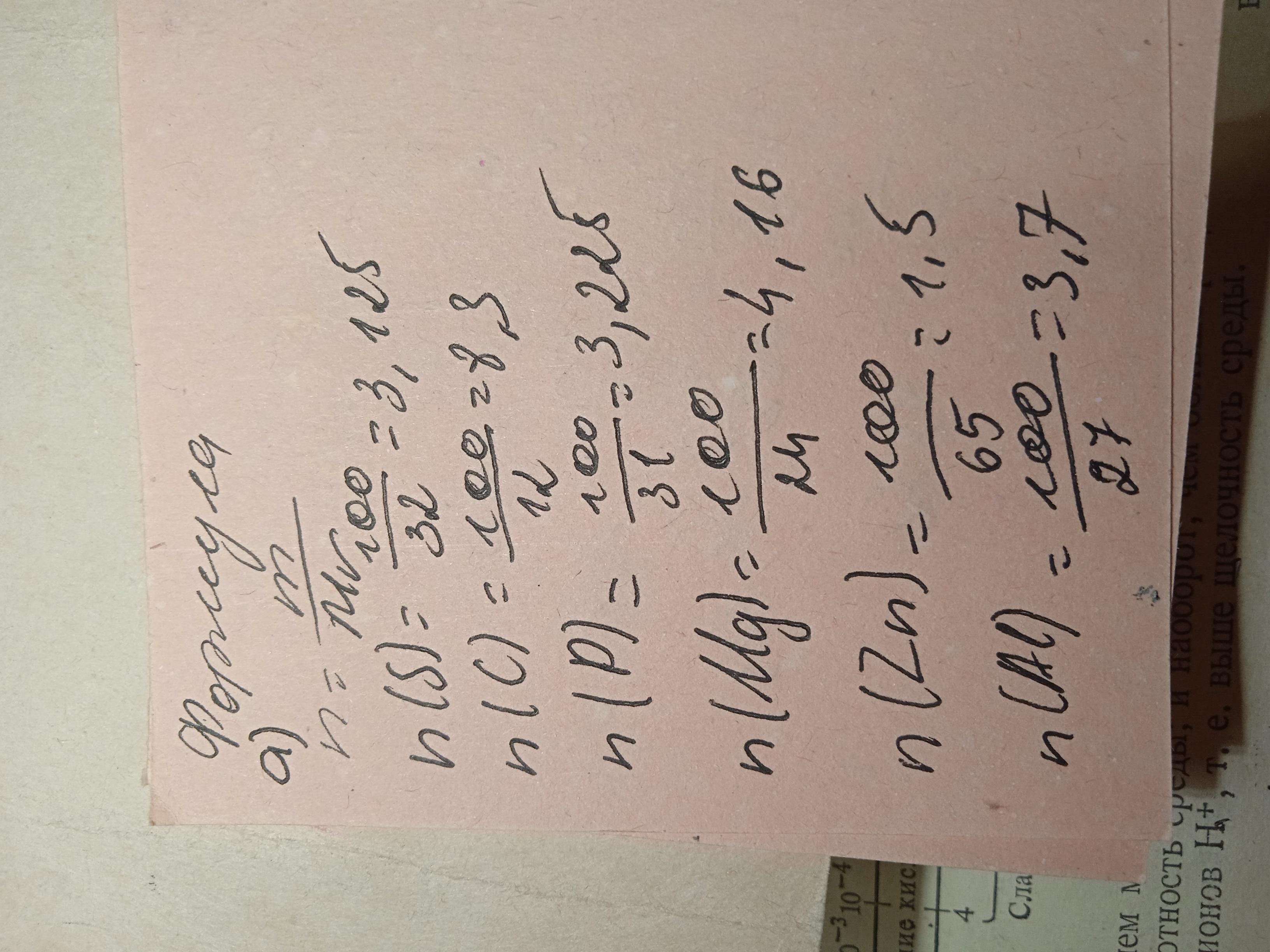 1. Даны вещества: а) S, C, P, Mg, Zn, Al; б) H2, N2, 02, Br2, Cl; в) 02, Co2 SO3 1) NН3 Н2S, NaCl. Вычисли количество вещества, если масса каждого из них разна 100 г (ответ округли до десятых)