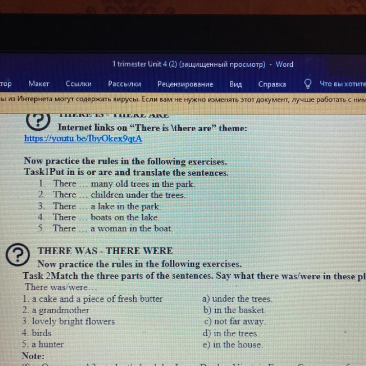 ТАМ БЫЛО... ТАМ БЫЛИ Теперь отрабатывайте правила в следующих упражнениях. Задание 2 Сопоставьте три части предложений. Скажите, что было/было в этих местах. Были, были... 1. пирожное и кусок свежего сливочного масла а) под деревьями. 2. бабушка б) в корзине. 3. прекрасные яркие цветы в) недалеко отсюда 4. птицы г) на деревьях. 5. охотник д) в доме.