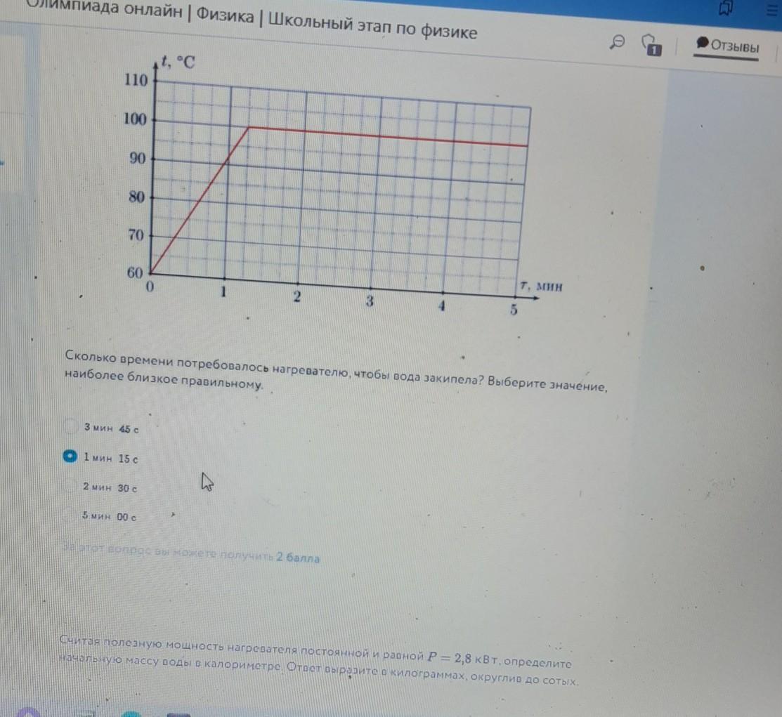 считая полезную мощность нагревателя постоянной и равной P равно 2,8 кВт, Определите начальную массу воды в калориметре