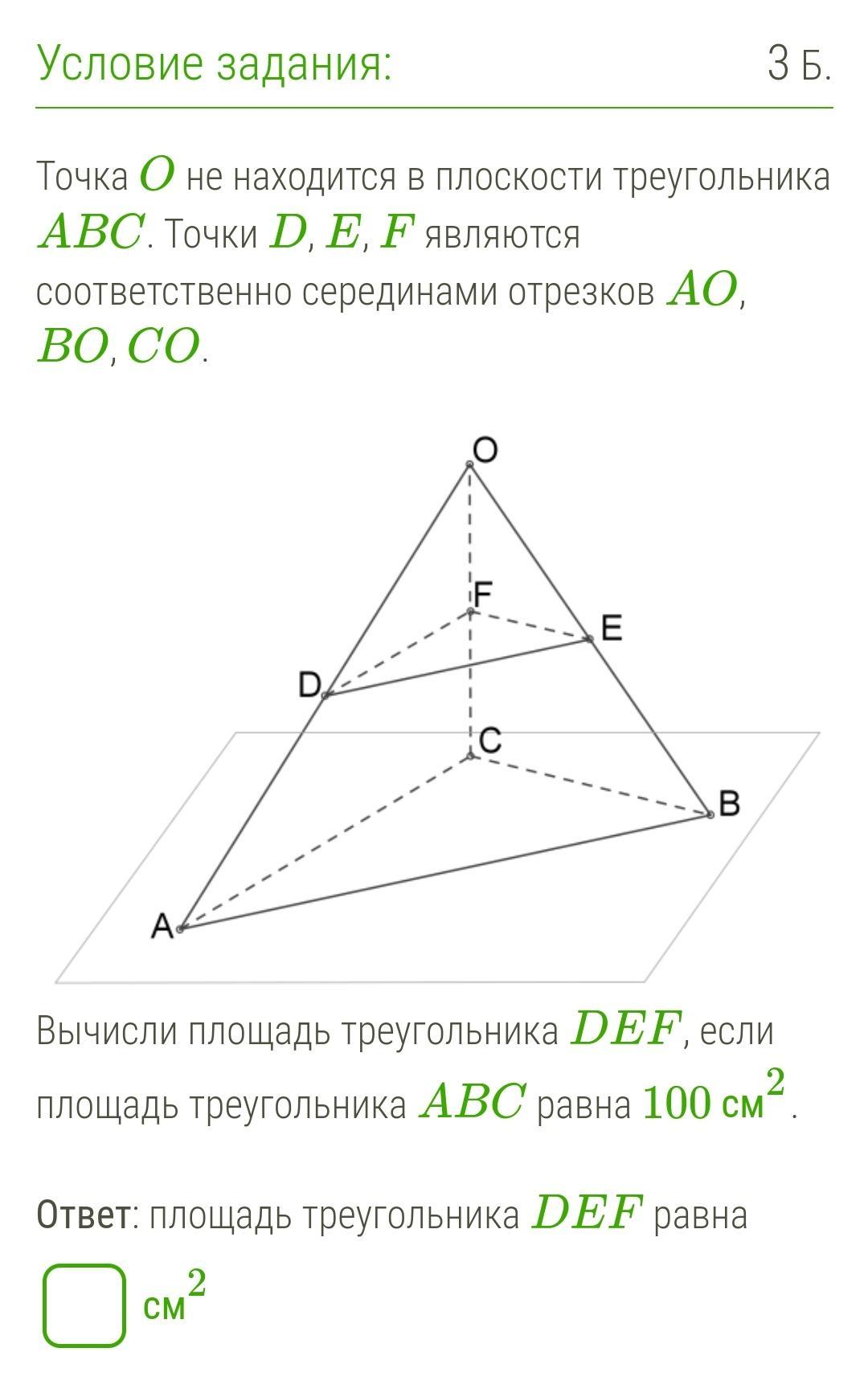 Точка O не находится в плоскости треугольника ABC. Точки D, E, F являются соответственно серединами отрезков AO, BO, CO.Вычисли площадь треугольника DEF, если площадь треугольника ABC равна 100 см2.
