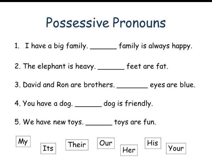 Possessive Pronouns 1. I have a big family... family is always happy. 2. The elephant is heavy. feet are fat. 3. David and Ron are brothers. eyes are blue. 4. You have a dog... dog is friendly. Your His Her Our Their 5. We have new toys... toys are fun. Its My
