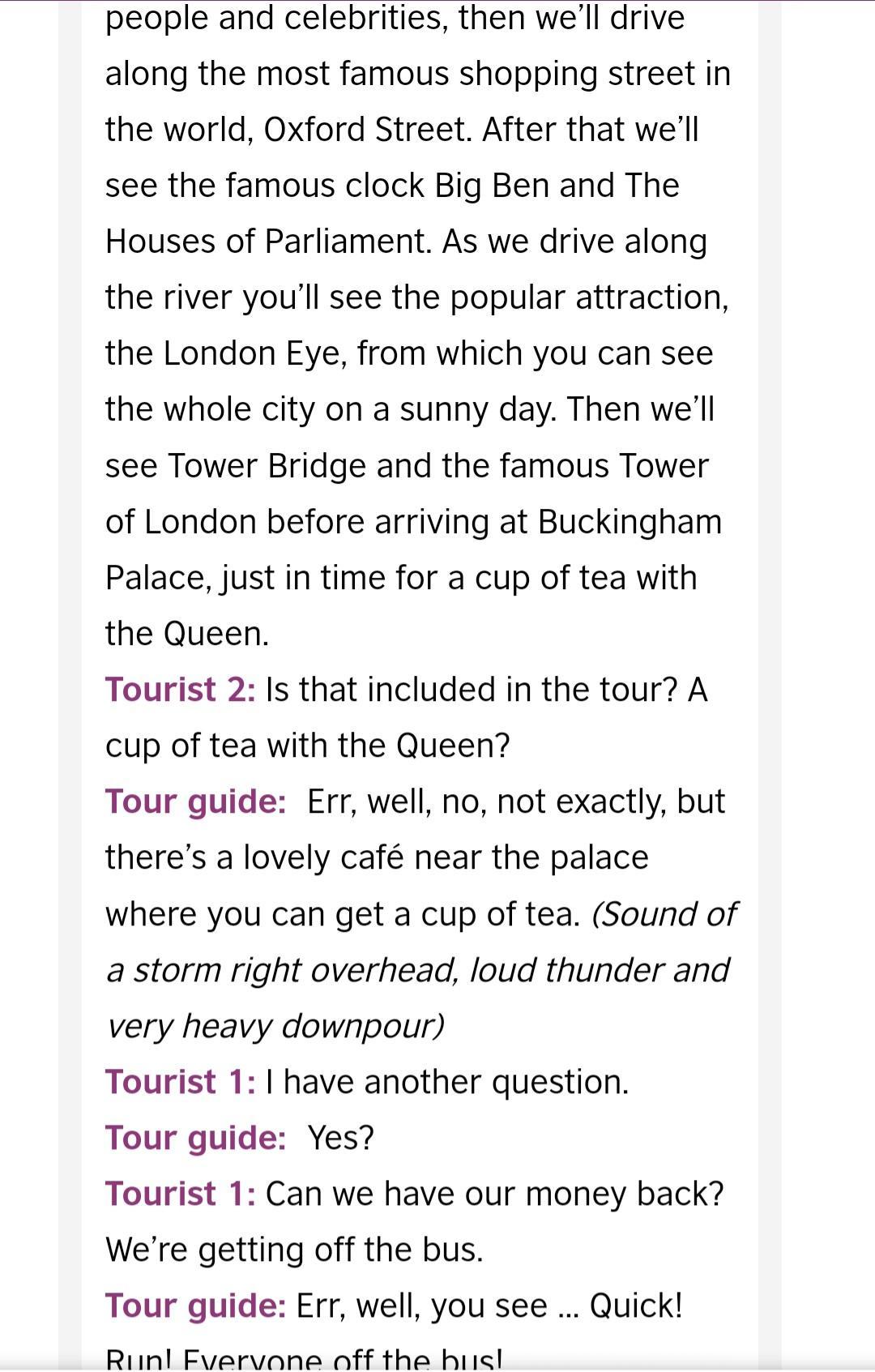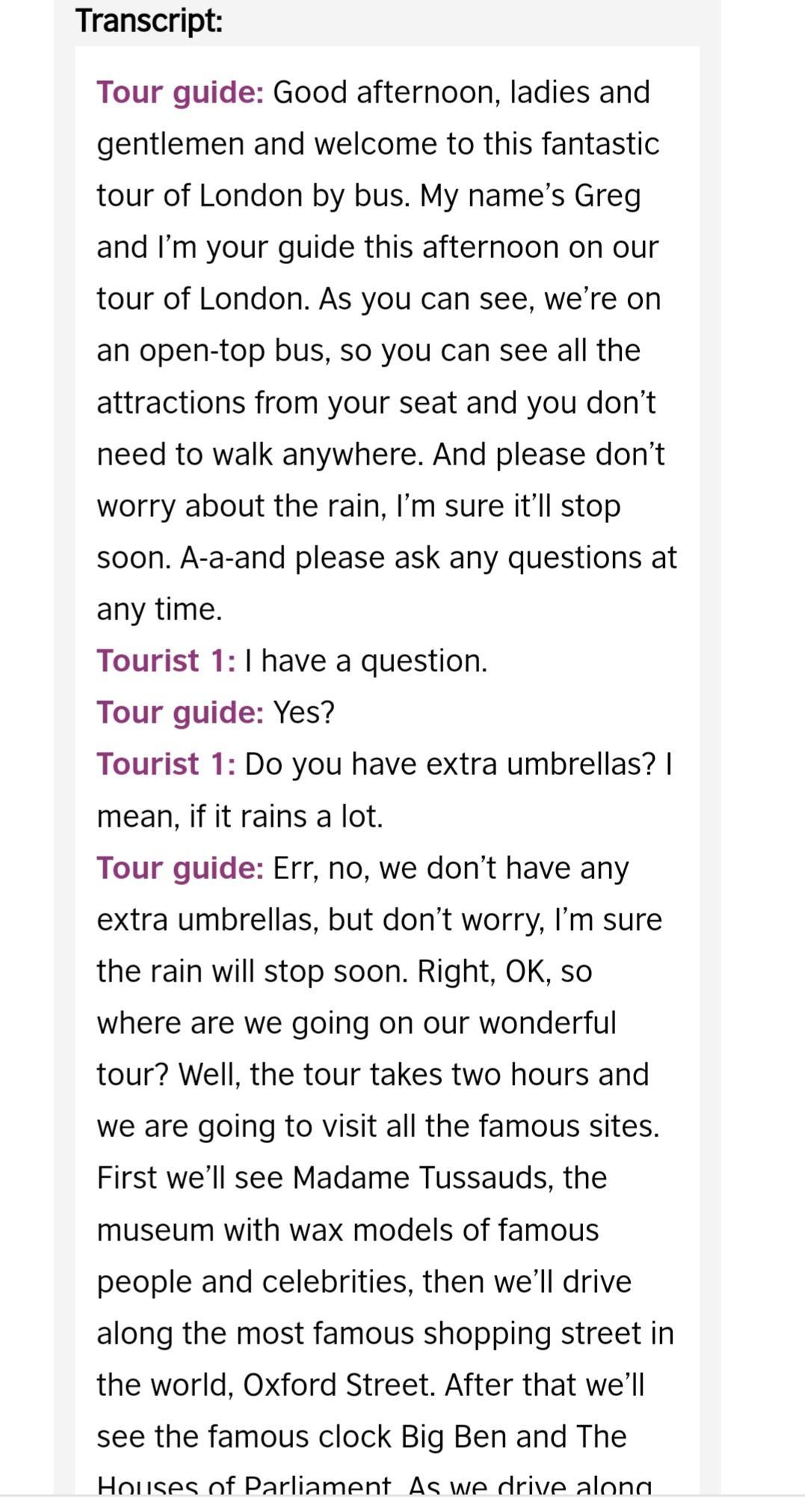Listening Task 2. Listen to the speakers twice and choose the best answer A, B or C. Circle the best word to complete these sentences. 1. Tourists traveled on an A) a double decker bus B) a micro bus C) an open top bus 2. Oxford Street is a famous street for A) shopping B) for drinking tea C) eating 3. Big Ben is a tour guide A) tower B) clock C) bridge 4. Tourists can have a cup of tea in A) the Queen's palace B) the famous Tower of London C) the nearest cafe
