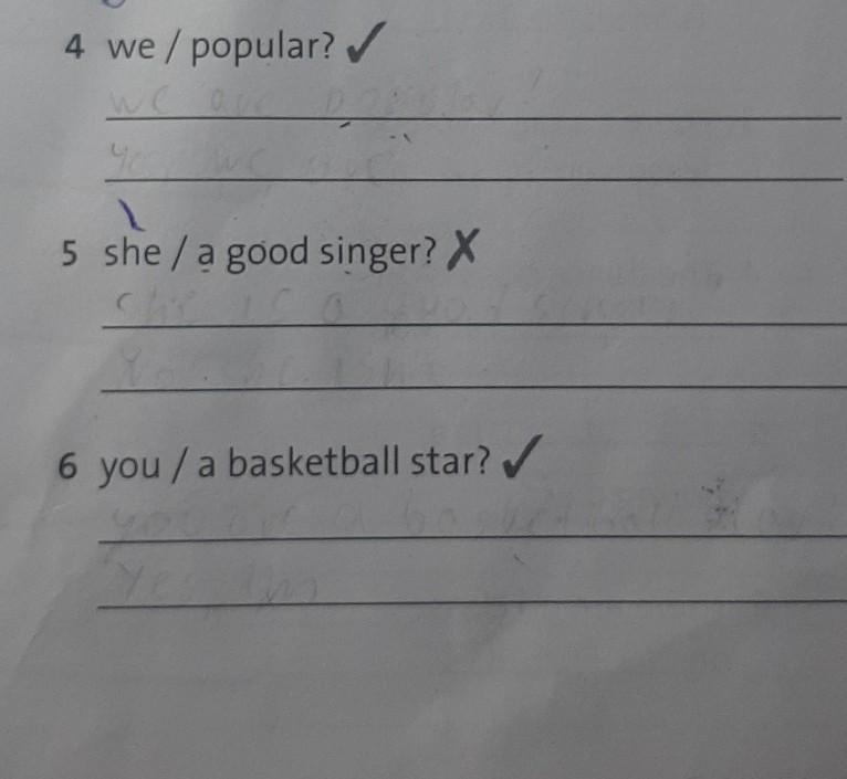 4 we / popular? ✓ w 5 she / a good singer? X 6 you/ a basketball star? bo Ye he