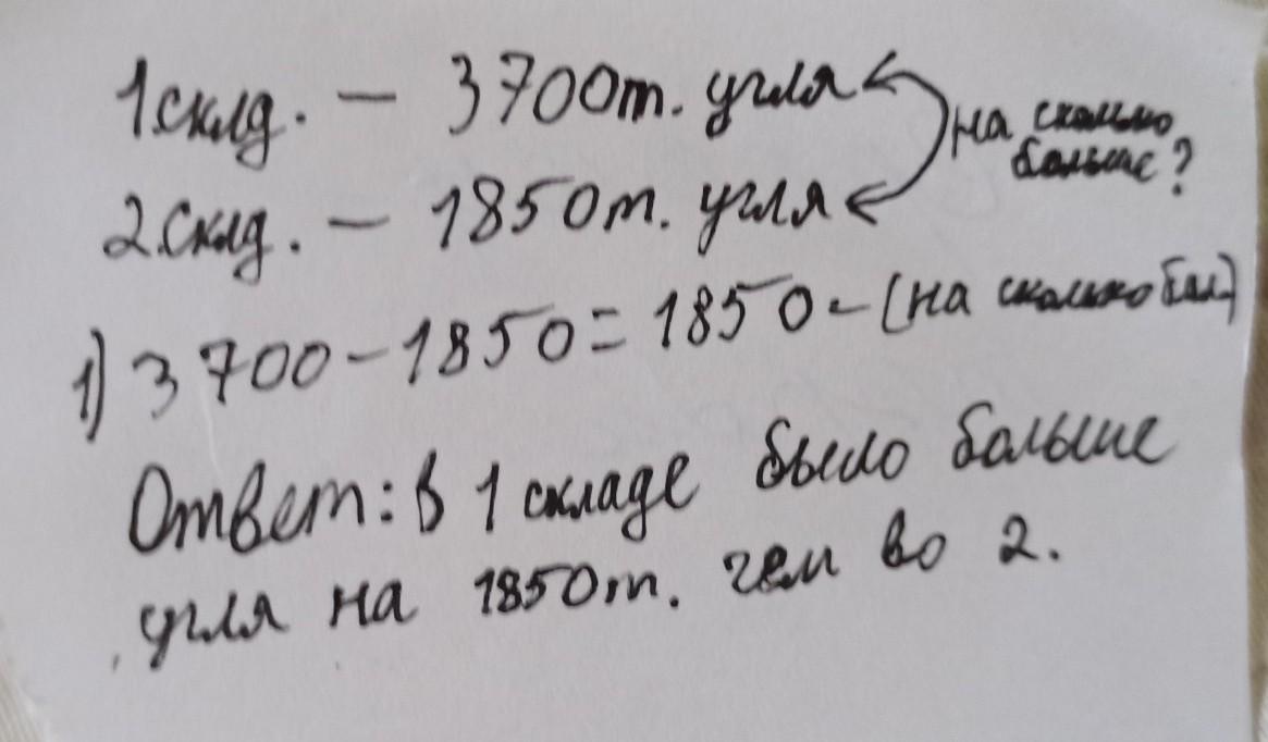На двух складах было 3700 т. Угля, причем на втором складе 1850 т. На каком складе угля было больше и насколько?