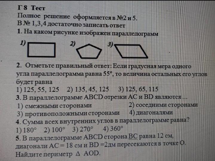 2) У пар-ма противоположные углы равны, значит второй угол 55°.