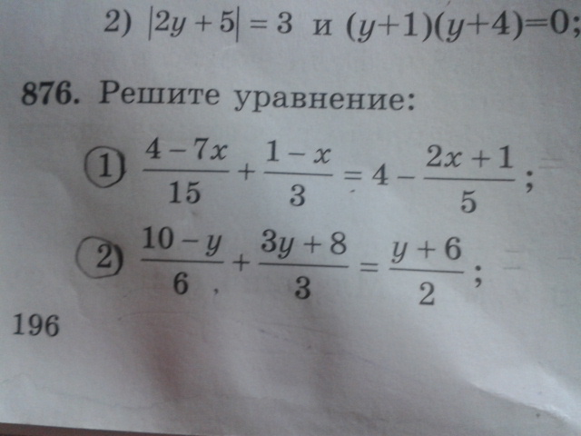 Первое действие - это приведение уравнения к общему знаменателю. ( и в первом и во втором уравнении. В первом уравнении общим знаменателем будет 15, во втором уравнении 6.После приведения к общему знаменателю получаем :