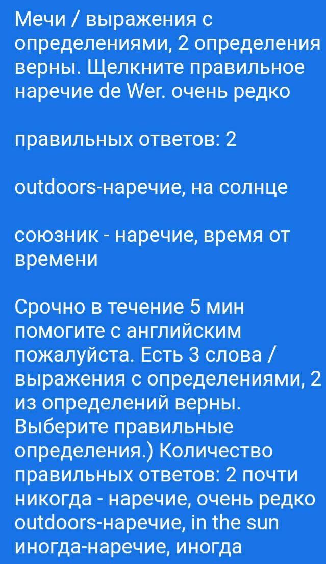 Срочно в течение 5 мин помогите с английским пожалуйста . Here are 3 words/expressions with definitions, 2 of the definitions are correct. Click the correct definitions. ) Number of correct answers: 2 hardly ever - adverb, very rarely outdoors -adverb, in the sun occasionally - adverb, now and then