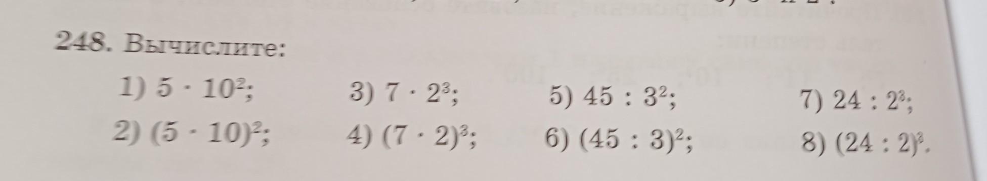 248. Вычислите: 1) 5 : 102; 2) (5. 10); 3) 7 - 23; 4) (7.2); 5) 45:32; 6) (45:3); 7) 24 : 22 8) (24 : 2)