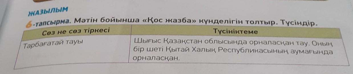 6-тапсырма. Мәтін бойынша «Қос жазба» күнделігін толтыр. Түсіндір. Сөз не сез тіркесі Түсініктеме Тарбағатай тауы Шығыс Қазақстан облысында орналасқан тау. Оның бір шеті Қытай Халық Республикасының аумағында орналасқан. пж