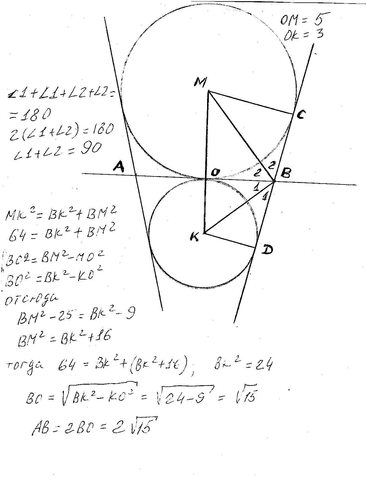 Две окружности с радиусами 5 и 3 касаются в точке О. Их общая касательная, проходящая через точку О, пересекает внешние касательные этих окружностей в точках А и В соответственно. Найдите АВ.
