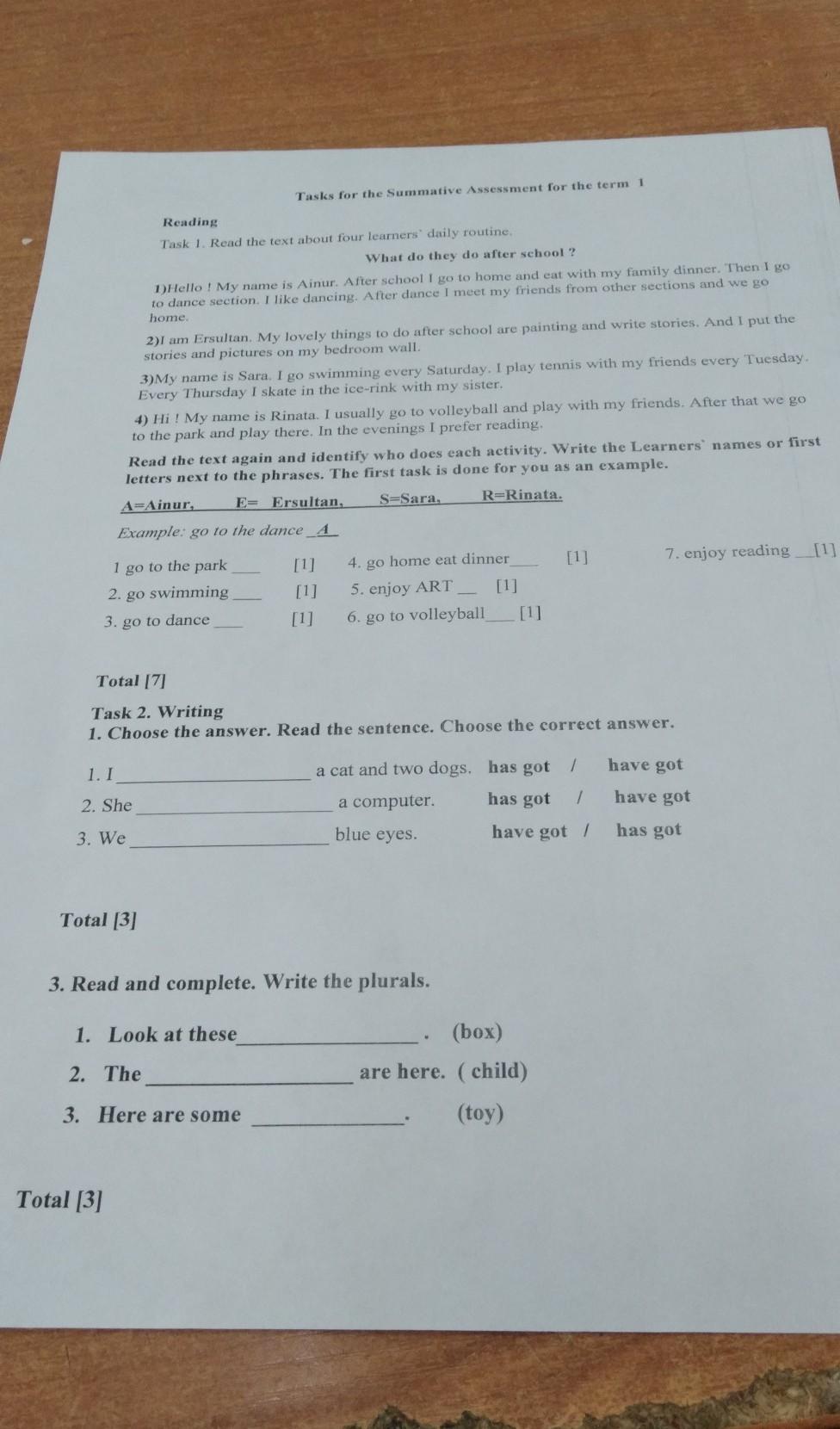 прочитать 4 текста, распознать (кто ходил в парк кто читал книгу и тд) отметить первой буквой имени