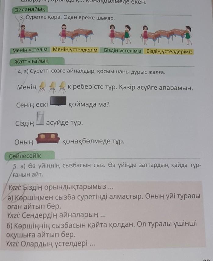 Ойланайық 3. Суретке қара. Одан ереже шығар. 2 Менің үстелім Менің үстелдерім Біздің үстеліміз Біздің үстелдеріміз Жаттығайық 4. а) Суретті сөзге айналдыр, қосымшаны дұрыс жалға. Менің А як кіреберісте тұр. Қазір асүйге апарамын. Сенің ескі қоймада ма? Cisain acymae Typ . асүйде тұр. Оның қонақбөлмеде тұр. Сөйлесейік 5. а) Өз үйіңнің сызбасын сыз. Өз үйіңде заттардың қайда тұр- ғанын айт. Үлгі: Біздің орындықтарымыз ... ә) Көршіңмен сызба суретіңді алмастыр. Оның үйі туралы оған айтып бер. Үлгі: Сендердің айналарың ... б) Көршіңнің сызбасын қайта қолдан. Ол туралы үшінші оқушыға айтып бер. Үлгі: Олардың үстелдері ...