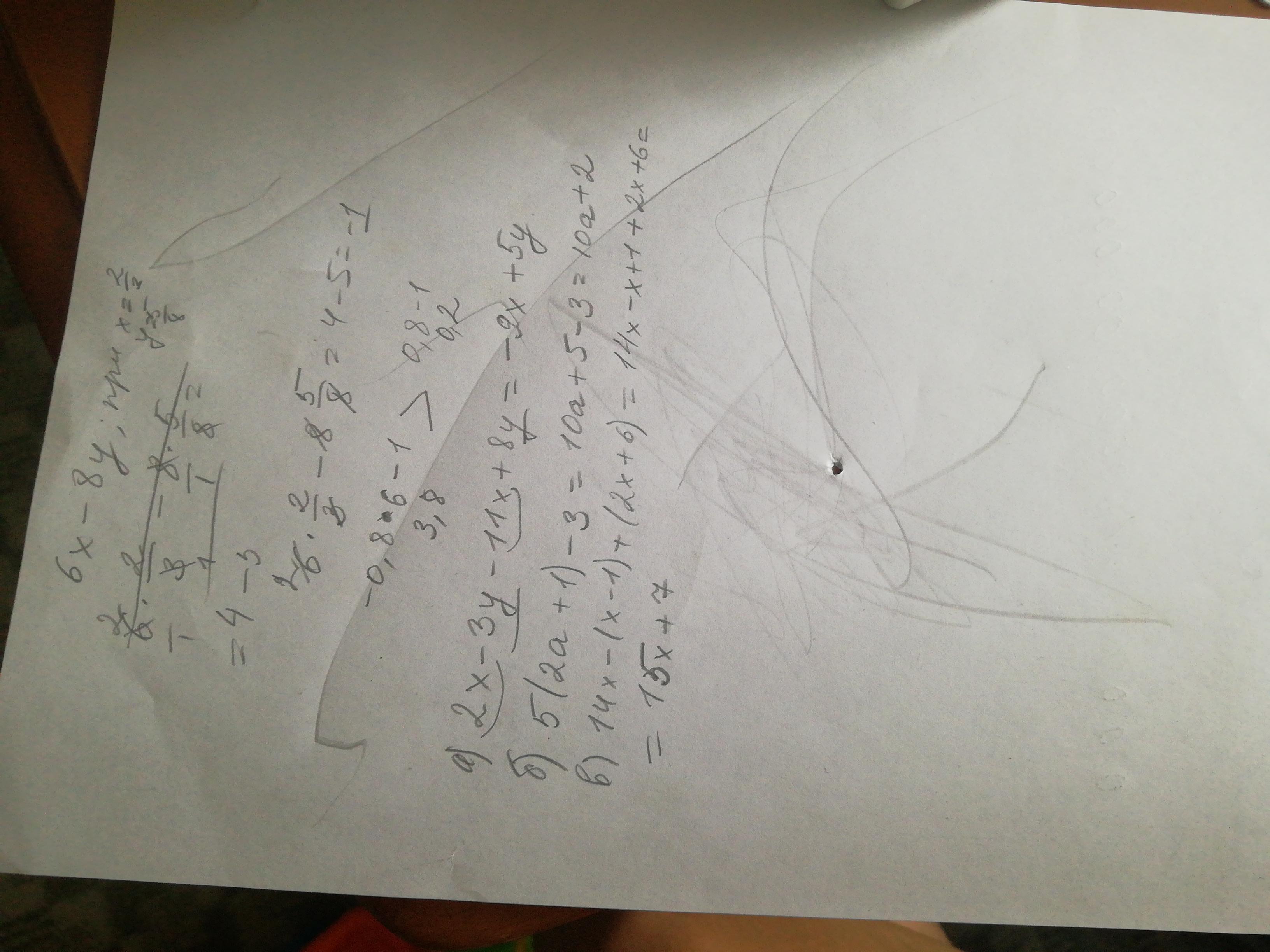 1) найдите значение выражения 6x - 8y при x = 2/3; y= 5/8... 2) Сравните значение выражений -0,8x - 1 и 0,8 - 1 при x = 6...3) Упросите выражение: а) 2x - 3y - 11x + 8y б) 5(2а + 1) - 3 в) 14x -(x-1) + (2x+ 6)