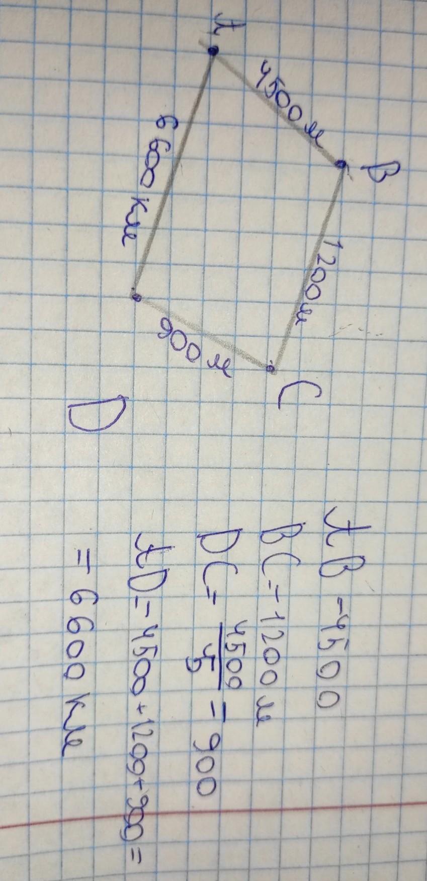 Села розташовані в точках А, В, С, D. АВ = 4500м, ВС = 1 км 200 м. Відомо, що довжина DС у п'ять разів менша, ніж АВ. Яку відстань потрібно пройти (у м) від села А до села D через села В і С?