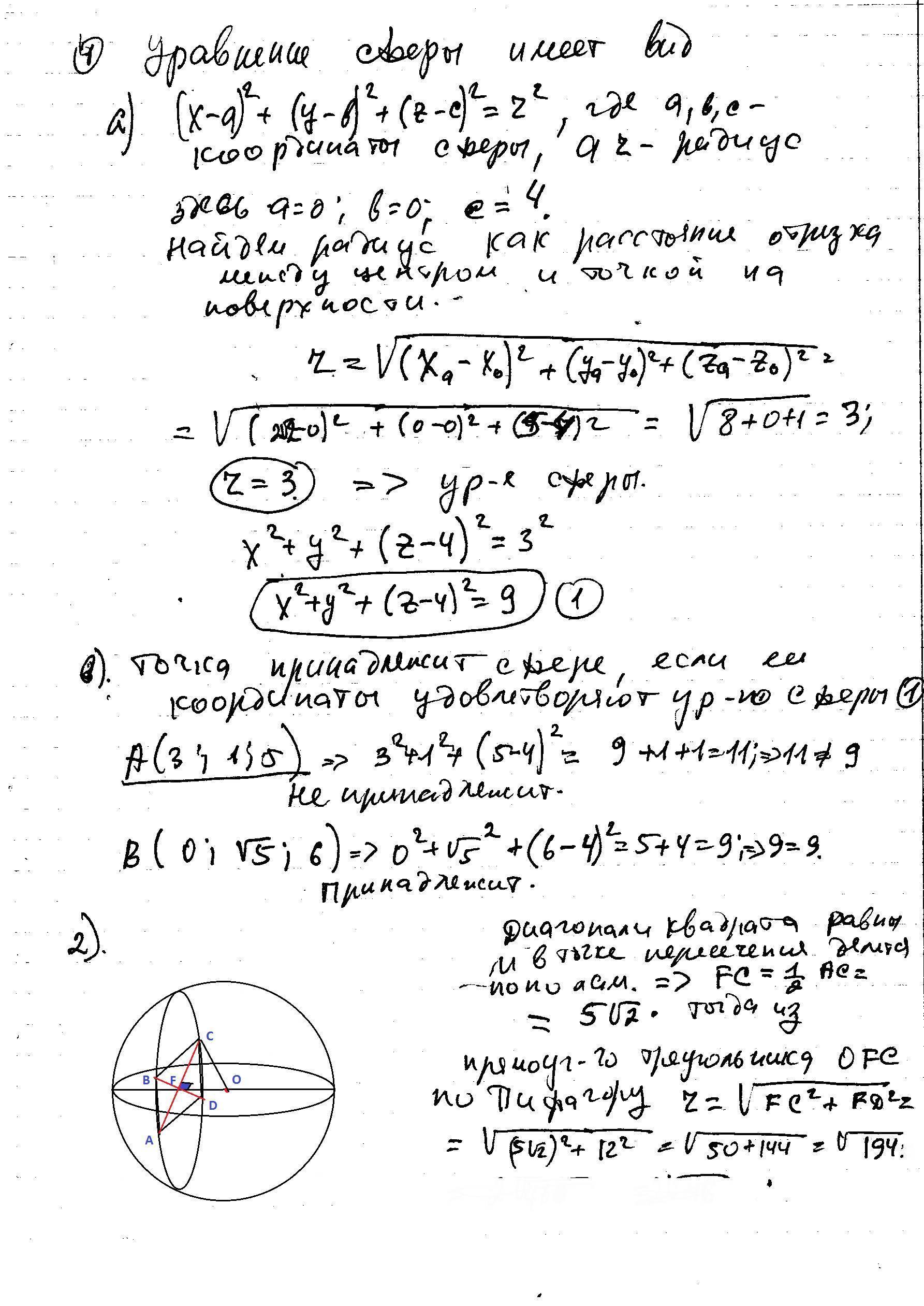 1.Центр сферы имеет координаты (0;0;4). Сфера проходит через точку (2корня из 2;0;5).