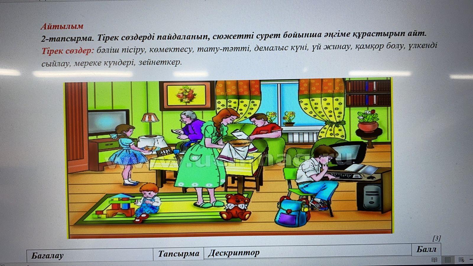 Бүкіл отбасы үйге келді. Бала ойнайды, ұлы сабақ береді, әжесі теледидар көреді, қызы анасына үстел қоюға көмектеседі, ал анасы торт пісіреді. Олардың тату отбасы бар. Бүгін әкем гаражға барды, өйткені бүгін демалыс. Отбасы тамақ ішіп, үйді бірге жинай бастайды. Үлкен ағасы үлкендерге құрмет туралы кітап оқиды. Отбасының әр мүшесі бір-біріне қамқорлық жасауы керек. Атасы қазірдің өзінде зейнеткер, ол тойлайды.