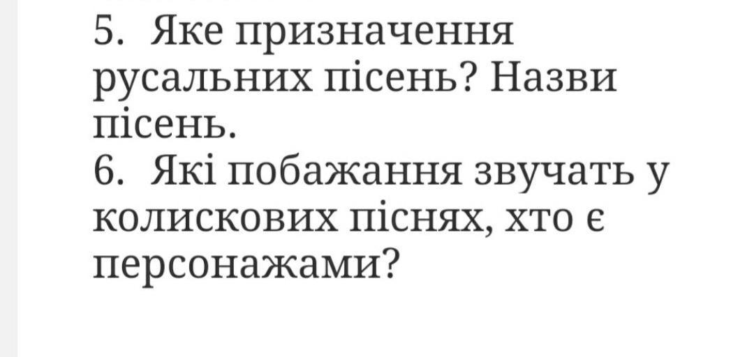 5. Їх співали на русальному тижні під час так званих «зелених свят». В язичеські часи це було свято закінчення весни і початку літа, пов’язане із культом рослинності і померлих предків. За народними повір’ями дівчата, які втопилися або померли засватаними, ставали русалками, а маленькі діти називались «русалками-семилітками». Їм відводилося місце у ріках, озерах, ставках. За народною демонологією ліси і поля населяли «русалочки-земляночки», яких називали ще мавками, нявками. Здавна вважали, що злі вітри та зливи - це робота русалок. Щоб хліба визріли й дали багатий урожай, потрібна тиха й тепла погода з невеликими дощами. Тому люди проводили обряди проганяння, або проводи, русалок. Це дійство відбувалося під час русального тижня (кінець травня - початок червня). Якщо під назвами маються на увазі приклади пісень, то ось: У ржі на межі; Ой біжить, біжить мала дівчина; Проведу я русалочки до бору.