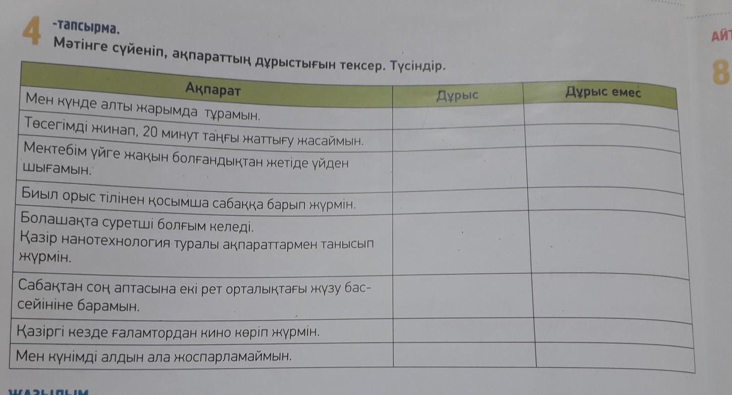 4 -тапсырма. Мәтінге сүйеніп, ақпараттың дұрыстығын тексер. Түсіндір. Дұрыс Дұрыс емес Ақпарат Мен күнде алты жарымда тұрамын. Төсегімді жинап, 20 минут таңғы жаттығу жасаймын. Мектебім үйге жақын болғандықтан жетіде үйден Шығамын. Биыл орыс тілінен қосымша сабаққа барып жүрмін. Болашақта суретші болғым келеді. Қазір нанотехнология туралы ақпараттармен танысып жүрмін. Сабақтан соң аптасына екі рет орталықтағы жүзу бас- сейініне барамын. Қазіргі кезде ғаламтордан кино көріп жүрмін. Мен күнімді алдын ала жоспарламаймын.
