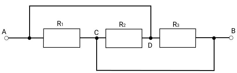 В схеме, представленной на рисунке, R1=1 Ом, R2=2 Ом, R3=3 Ом, напряжение (UAB) между точками A и B составляет 3 В.