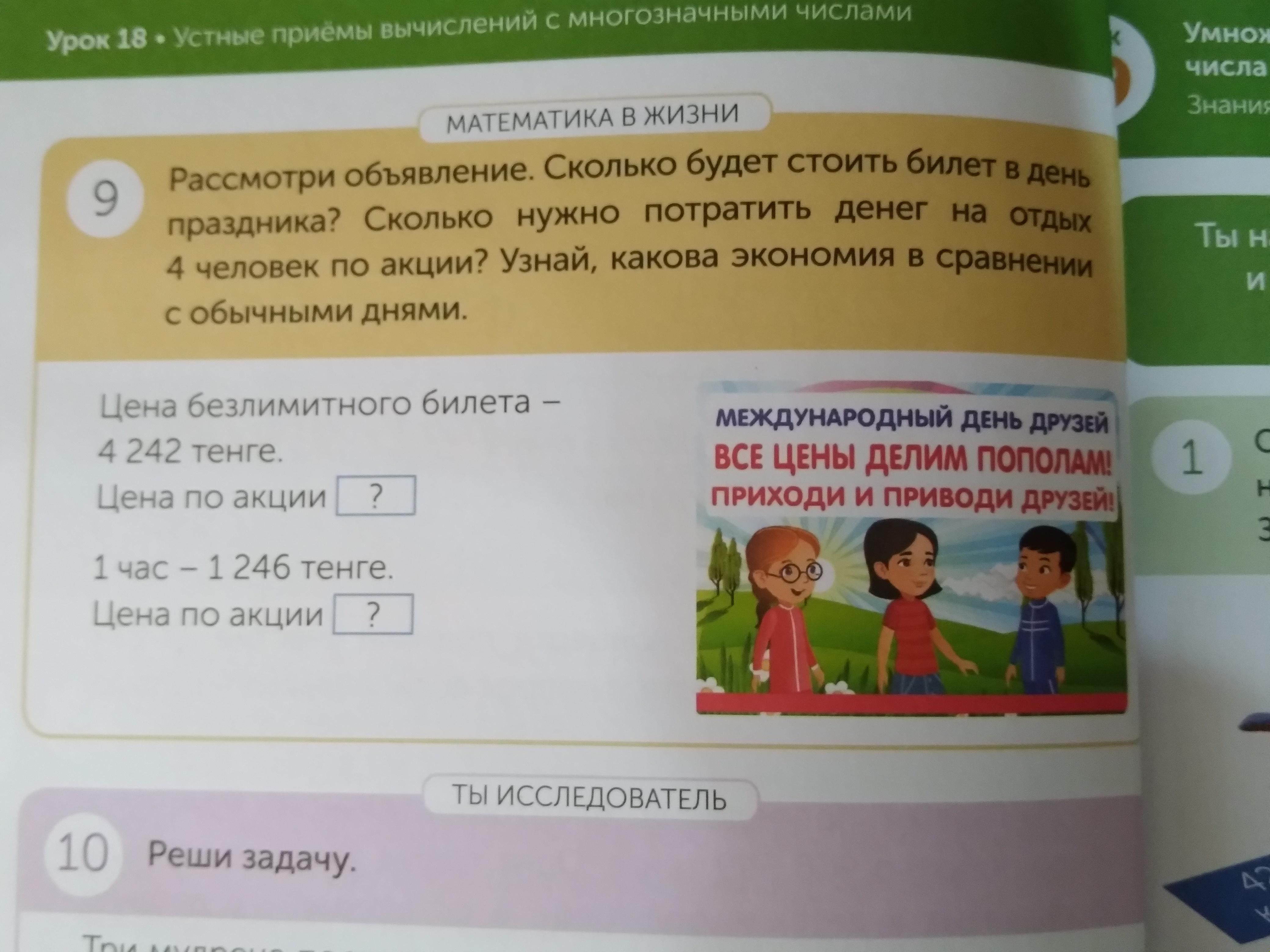 9 Рассмотри объявление. Сколько будет стоить билет в день праздника? Сколько нужно потратить денег на отдых 4 человек по акции? Узнай, какова экономия в сравнении с обычными днями. Помогитееее пожалуйстаааа я дам 50 баллов! ( я могу ждать только до 2 часа. )