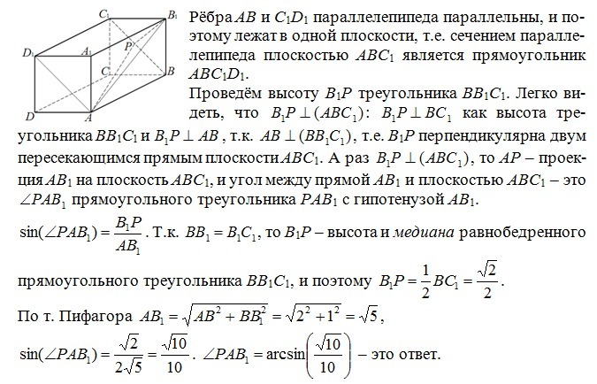 В прямоугольном параллелепипеде ABCDA1B1C1D1 известны AB=2, AD=AA1=1. Найдите угол между прямой AB1 и плоскостью ABC1.