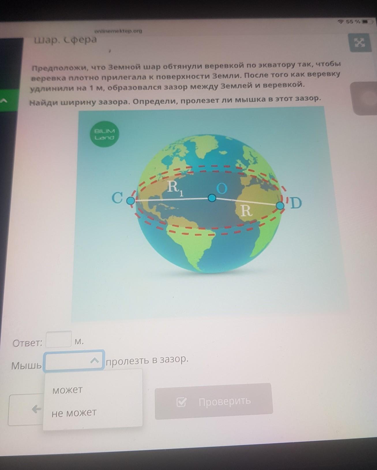 Шар. Сфера Предположи, что Земной шар обтянули веревкой по экватору так, чтобы веревка плотно прилегала к поверхности Земли. После того как веревку удлинили на 1 м, образовался зазор между Землей и веревкой. Найди ширину зазора. Определи, пролезет ли мышка в этот зазор
