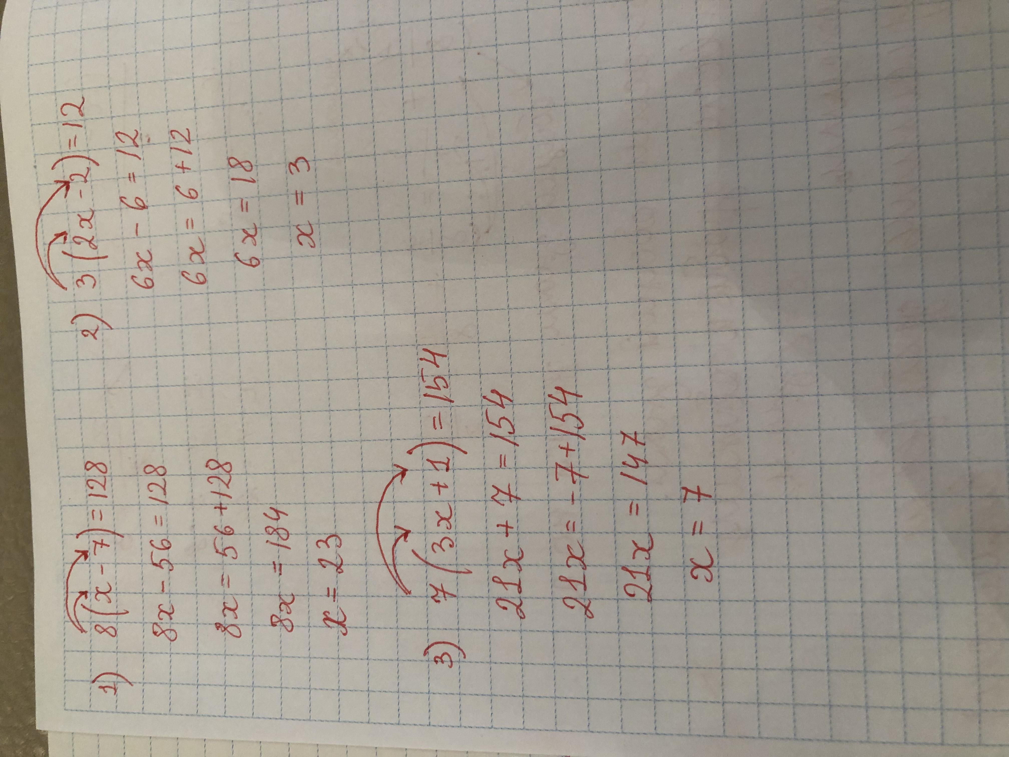 8(x-7)=128 3(2x-2)=12 7(3x+1)=154
