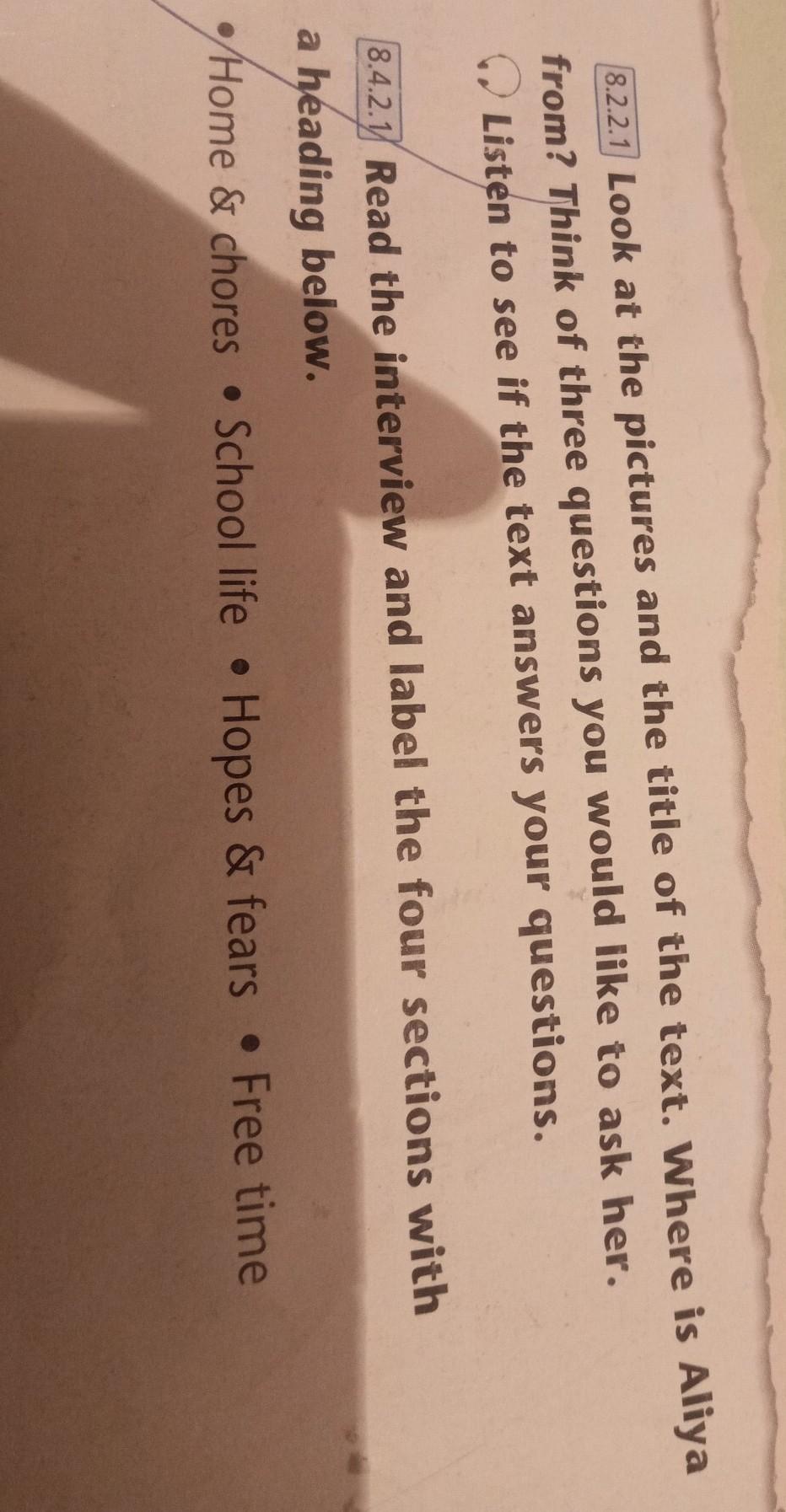 перевод:8.2.2.1 Посмотрите на картинки и название текста. Откуда Алия? Подумайте о трех вопросах, которые вы хотели бы ей задать.