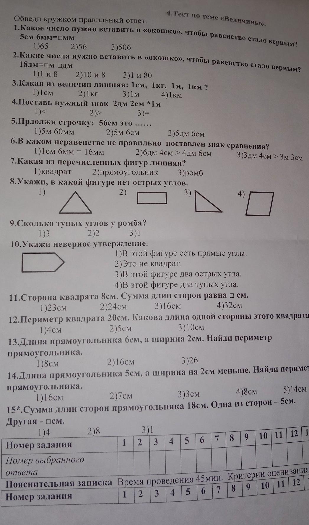 4.Тест по теме «Величины». Обведи кружком правильный ответ. 1.Какое число нужно вставить в кокошко», чтобы равенство стало верным? 5см 6мм=0мм 1165 2)56 3)506 2.Какие числа нужно вставить в кокошко», чтобы равенство стало верным? 18дм=ом одм 1)1 и 8 2)10 и 8 3)1 и 80 3.Какая из величин лишняя: 1см, 1кг, 1м, 1км ? 1)1 см 2) 1 кг 3)1 м 4) 1 км 4.Поставь нужный знак 2дм 2см * 1м 1)< 2)> 3) 5.Прдолжи строчку: 56см это ...... 15м 60мм 2)5м 6см 3)5дм 6см 6.В каком неравенстве не правильно поставлен знак сравнения? 1)1см 6мм = 16мм 2)6дм 4см > 4дм 6см 3)3 дм 4см > 3м 3см 7.Какая из перечисленных фигур лишняя? 1) квадрат 2 )прямоугольник 3)ромб 8. Укажи, в какой фигуре нет острых углов. 1) 2) 3) 4) П 9.Сколько тупых углов у ромба? 1)3 2)2 3)1 10. Укажи неверное утверждение. 1 )В этой фигуре есть прямые углы. 2)Это не квадрат. 3)В этой фигуре два острых угла. 4)В этой фигуре два тупых угла. 11.Сторона квадрата 8см. Сумма длин сторон равна о см. 1)23см 2)24см 3) 16см 4)32см 12.Периметр квадрата 20см. Какова длина одной стороны этого квадрата? 1)4см 2)5см 3)10см 13.Длина прямоугольника 6см, а ширина 2см. Найди периметр прямоугольника. 1)8см 2)16см 3)26 14.Длина прямоугольника 5см, а ширина на 2см меньше. Найди периметр прямоугольника, 1)16см 2)7см 3)3см 5)14см 15*. Сумма длин сторон прямоугольника 18см. Одна из сторон – 5см. Другая - осм. 114 2)8 3)1 Номер задания 1 2 3 4 5 6 4)8см 7 8 9 10 11 12 13