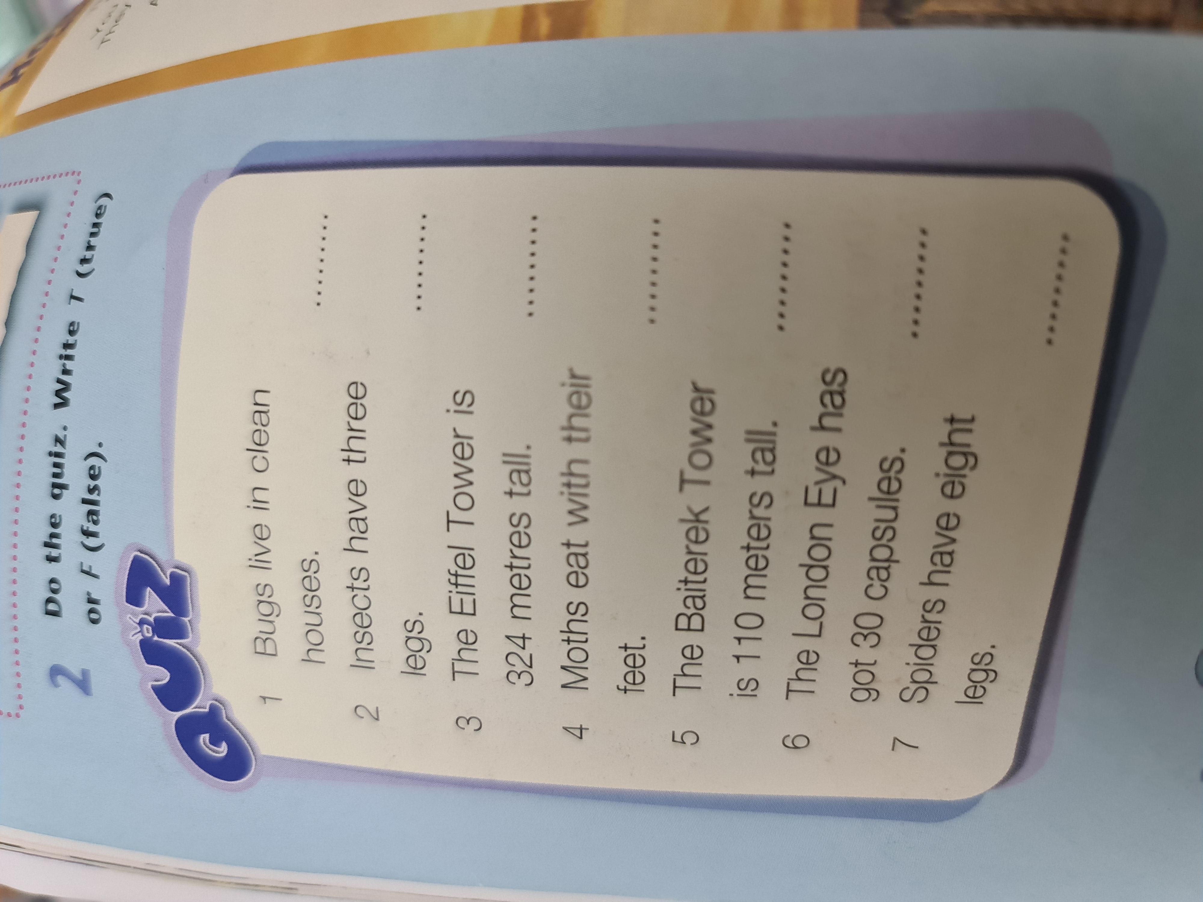 Первое переводится "Жуки живут в чистых домах", естественно это неправда, поэтому False. Второе же, переводится как "Мотыльки питаются с помощью ног", это тоже неправда, ведь они не питаются с помощью "ног".